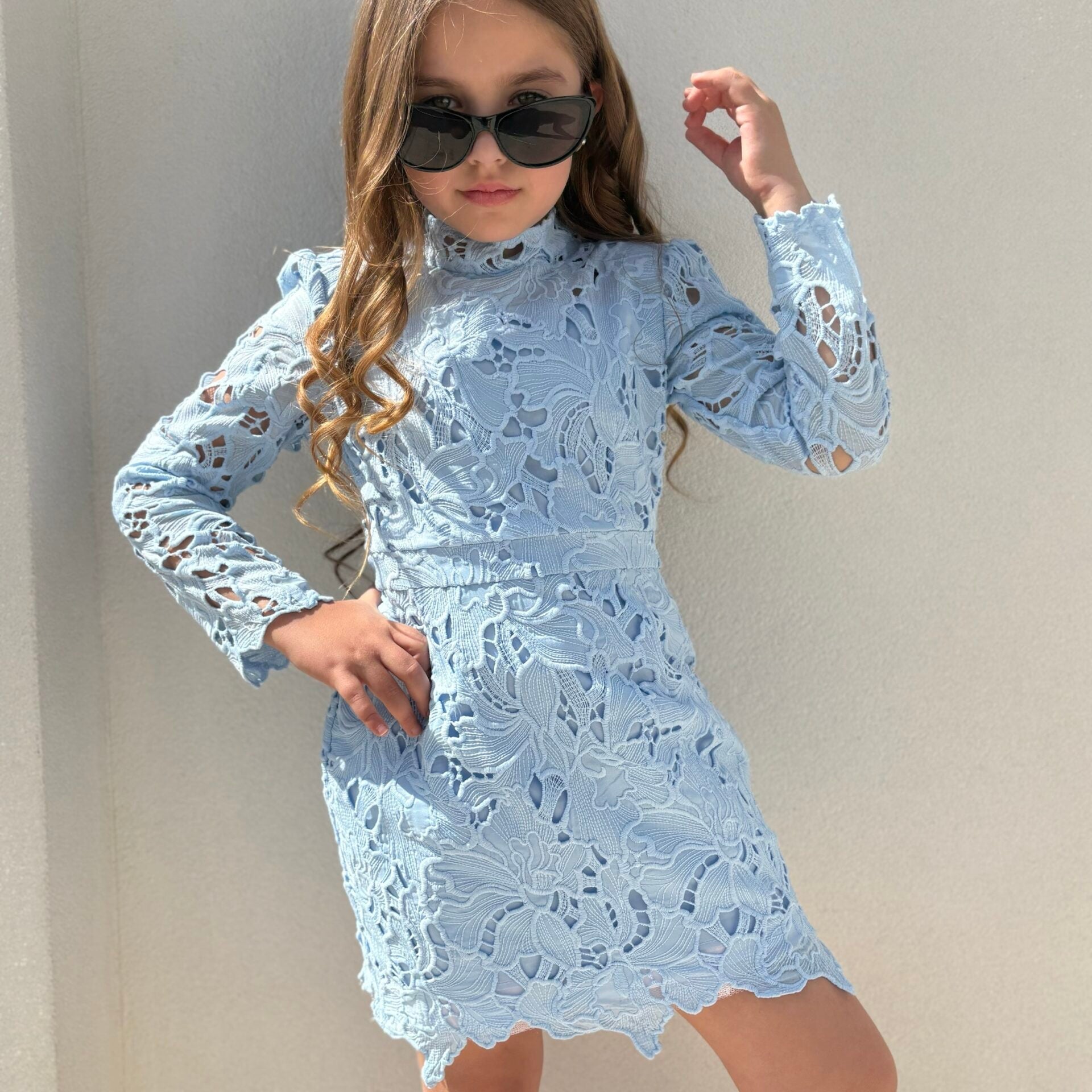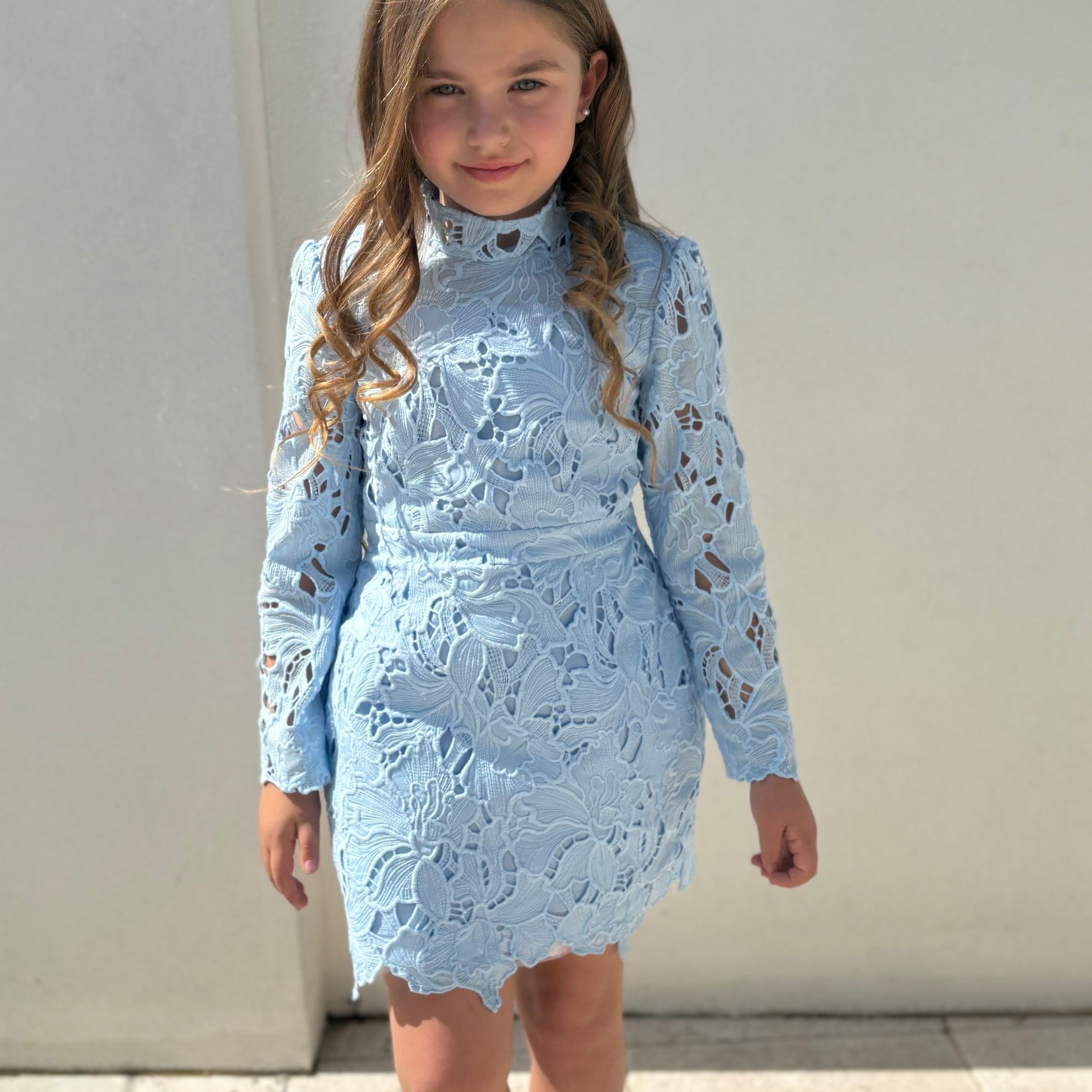 This exclusive JNR LUX CLOSET design features hand-dyed lace in a stunning azure hue, expertly crafted for a polished look. The high neckline with internal lining is complemented by structured shoulder pads and a concealed back zipper for easy dressing. A tulle underlay creates the signature tulip silhouette, while the cinched waist defines the figure beautifully. The lace construction has minimal stretch, so sizing up is recommended for optimal comfort and fit. Our 7-year-old model wears size 8 in this style.
