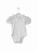 This white bodysuit by MONNALISA features a delicate lace collar and short sleeves. It is designed with button closures on the back and bottom, as well as lace finishing, rouches details, and a front embellished with strass. Made in Italy, the bodysuit is composed of 100% cotton.