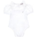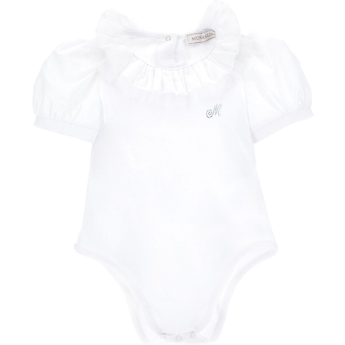 This ivory bodysuit by MONNALISA features a delicate lace collar and short sleeves. It is designed with button closures on the back and bottom, as well as lace finishing, rouches details, and a front embellished with strass. Made in Italy, the bodysuit is composed of 100% cotton.