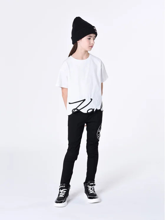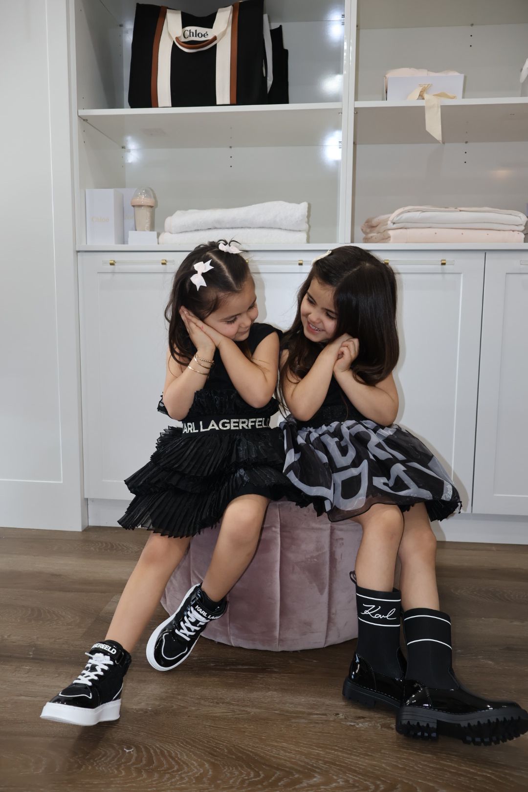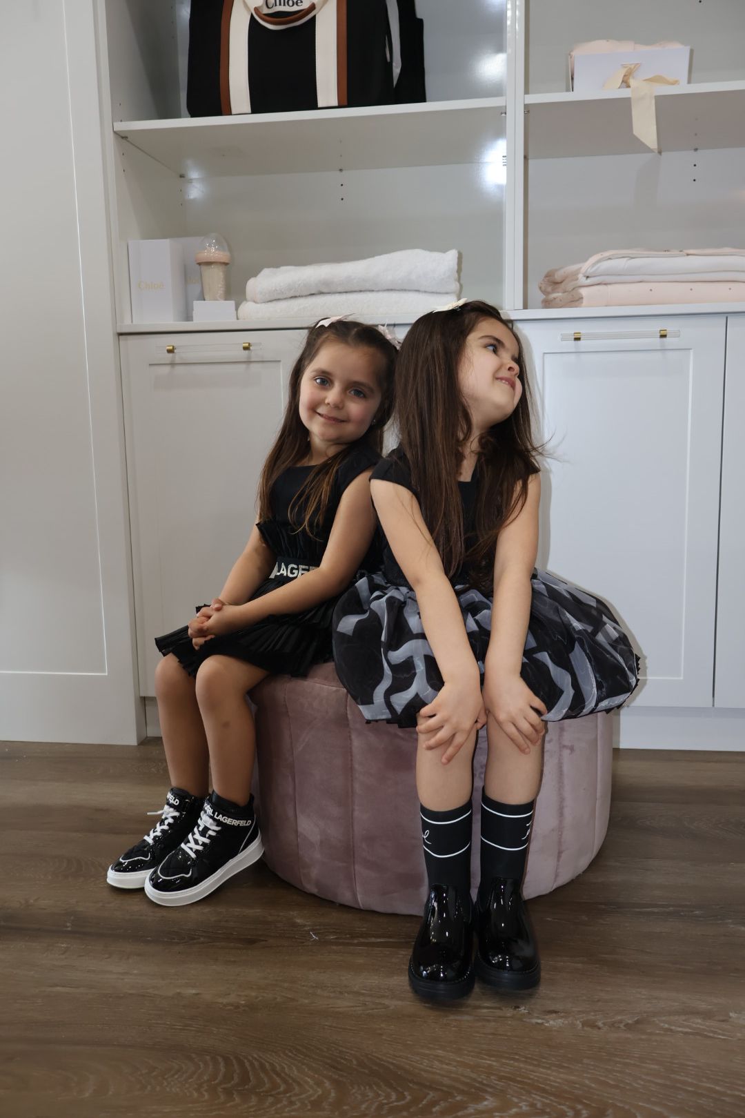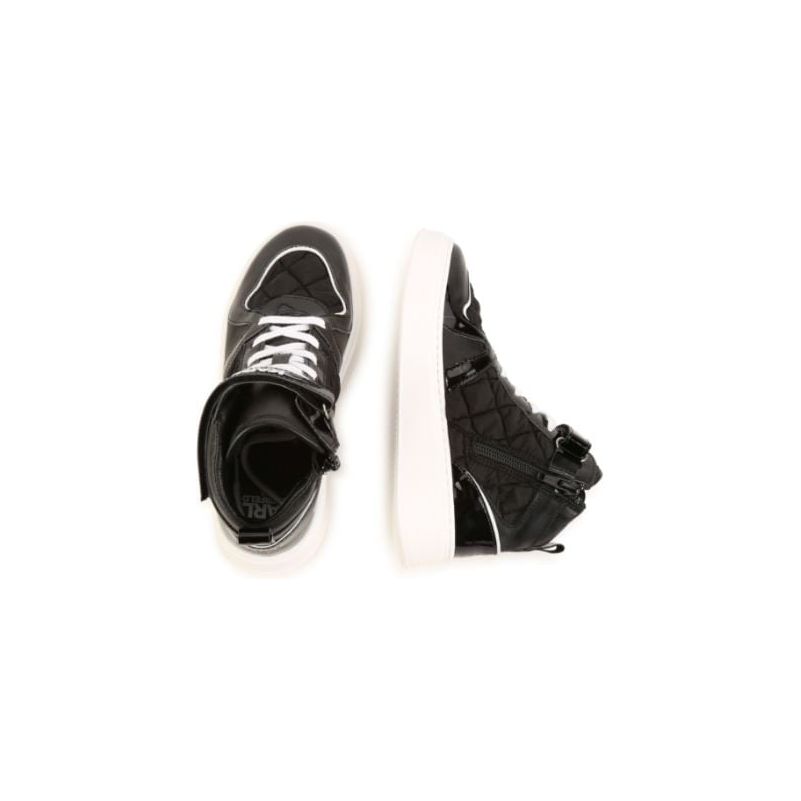 A pair of Black High Top Boots by KARL LAGERFELD designed with leather and mesh materials, showcasing a logo print on the front. Featuring a heel pull-tab, round toe, front lace-up and touch-strap fastenings, as well as a short side zip fastening. The branded insole and flat rubber sole add to the durability and comfort of these boots. Made from 100% fabric outer, 100% leather lining, and 100% rubber sole.