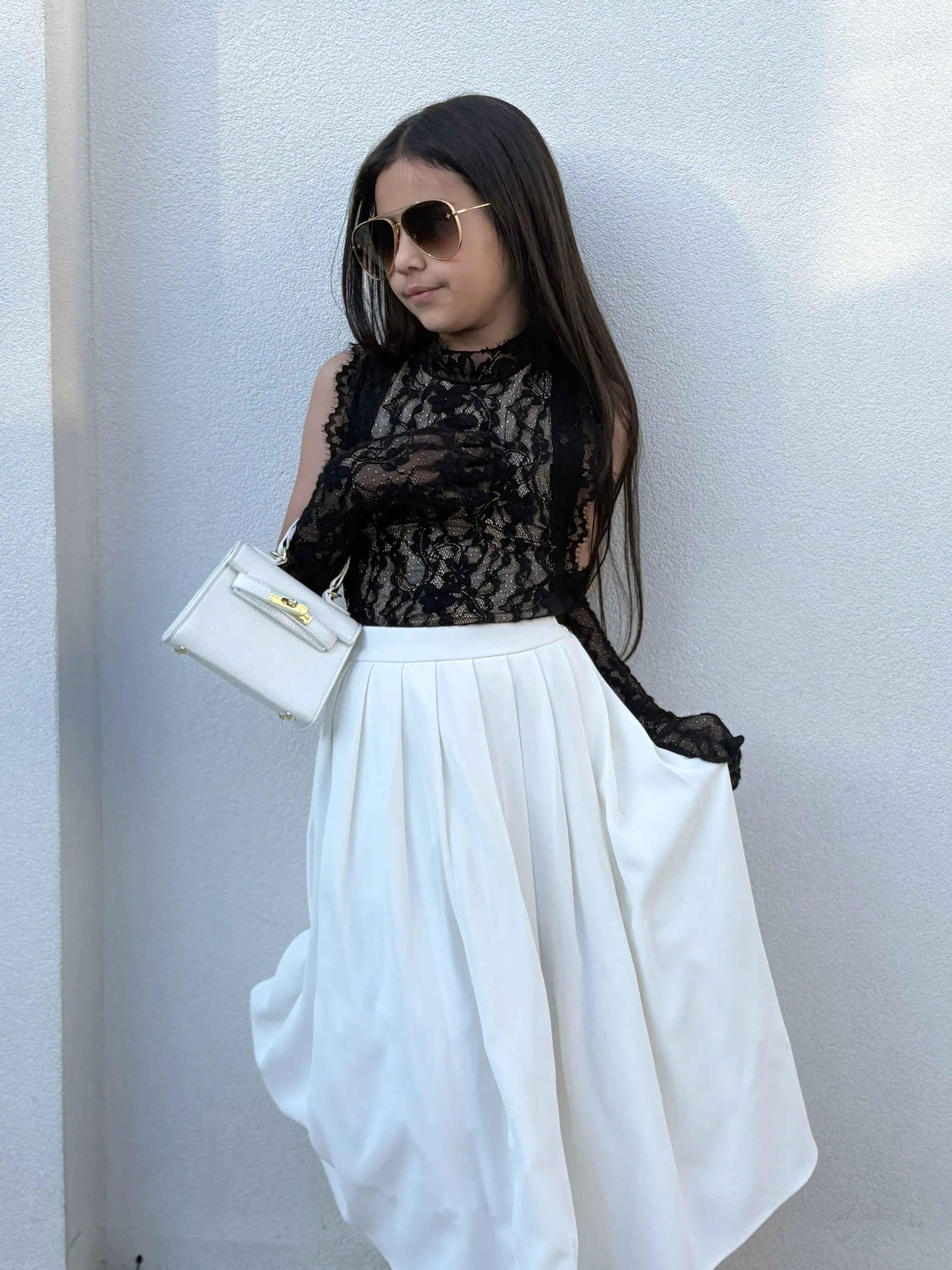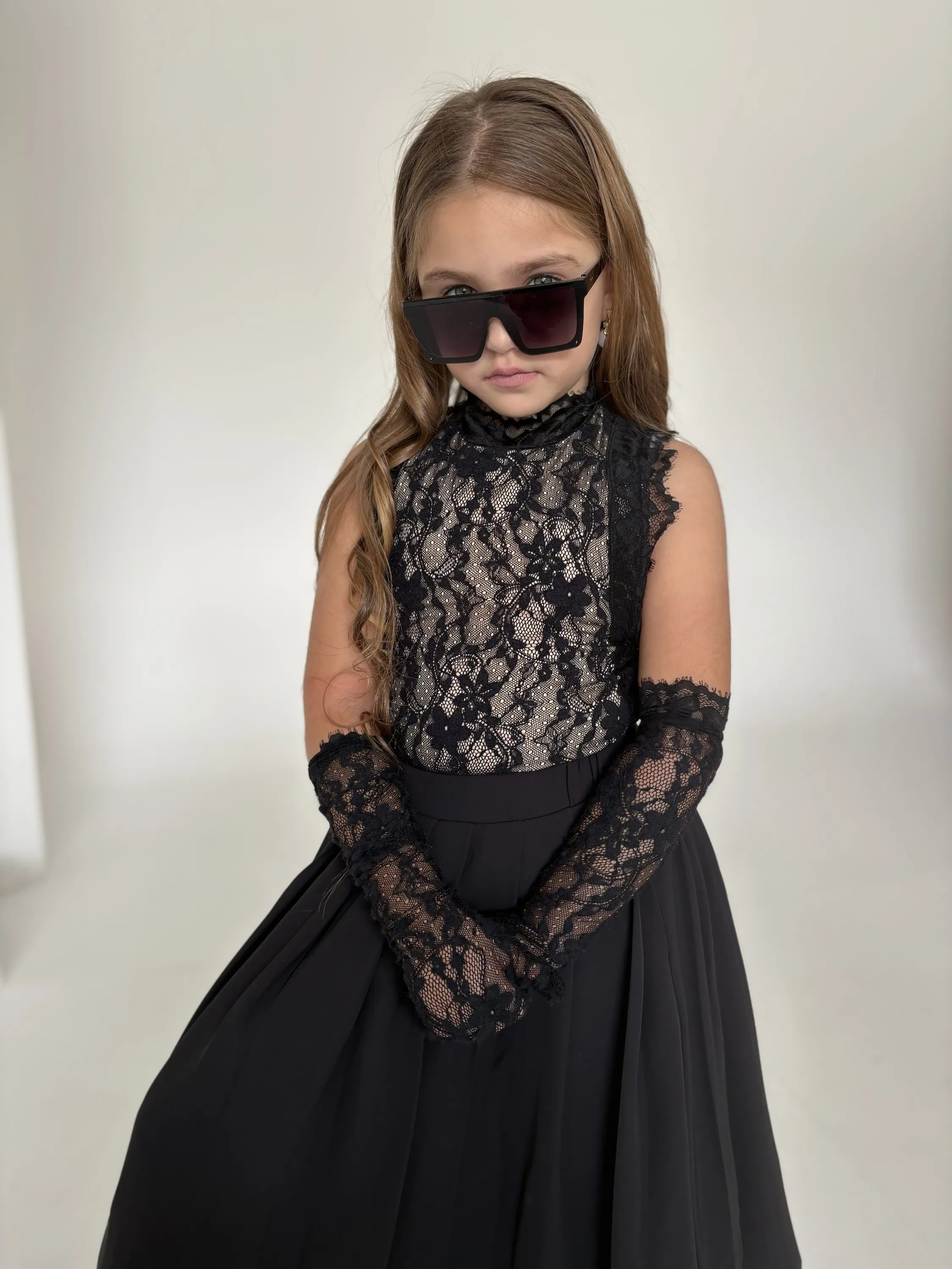 JNR LUX CLOSET EXCLUSIVE DESIGN Halter neck style lace top Nude lining Low back with exposed zipper on back Comes with gloves Model 1 is 7 years old wearing size 7 Model 2 is 7 years old wearing size 7