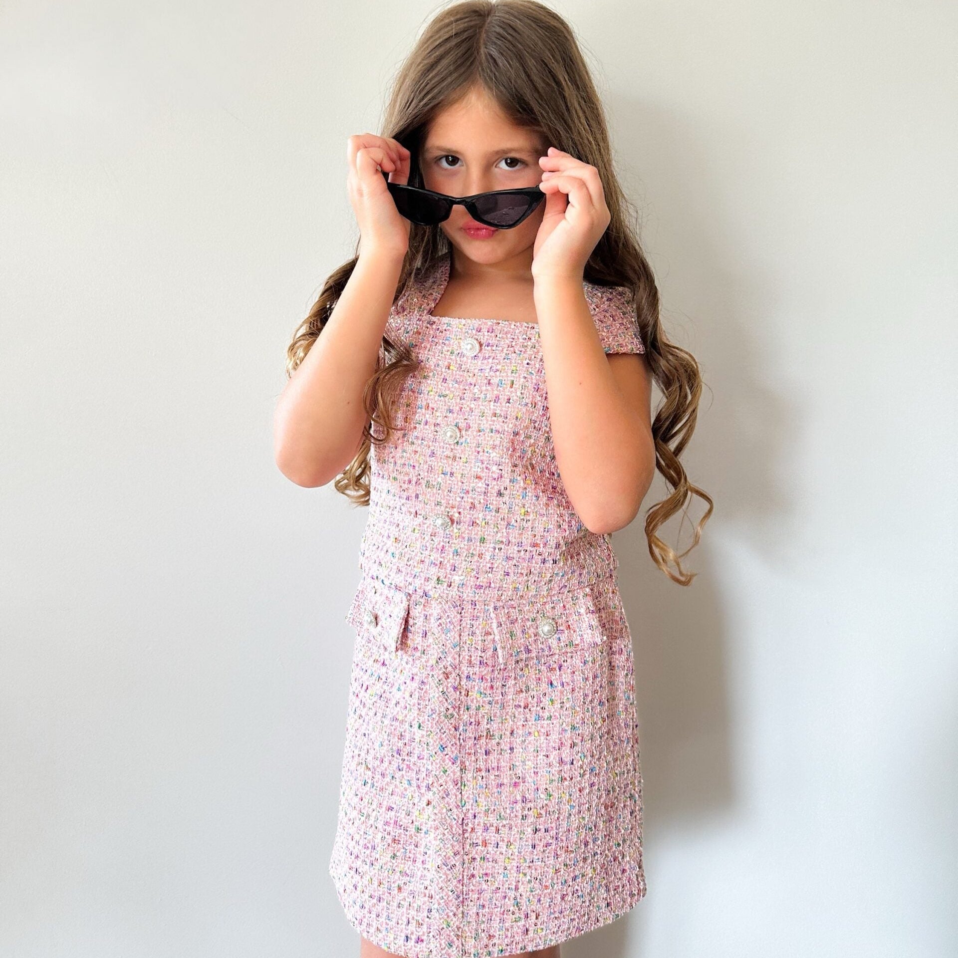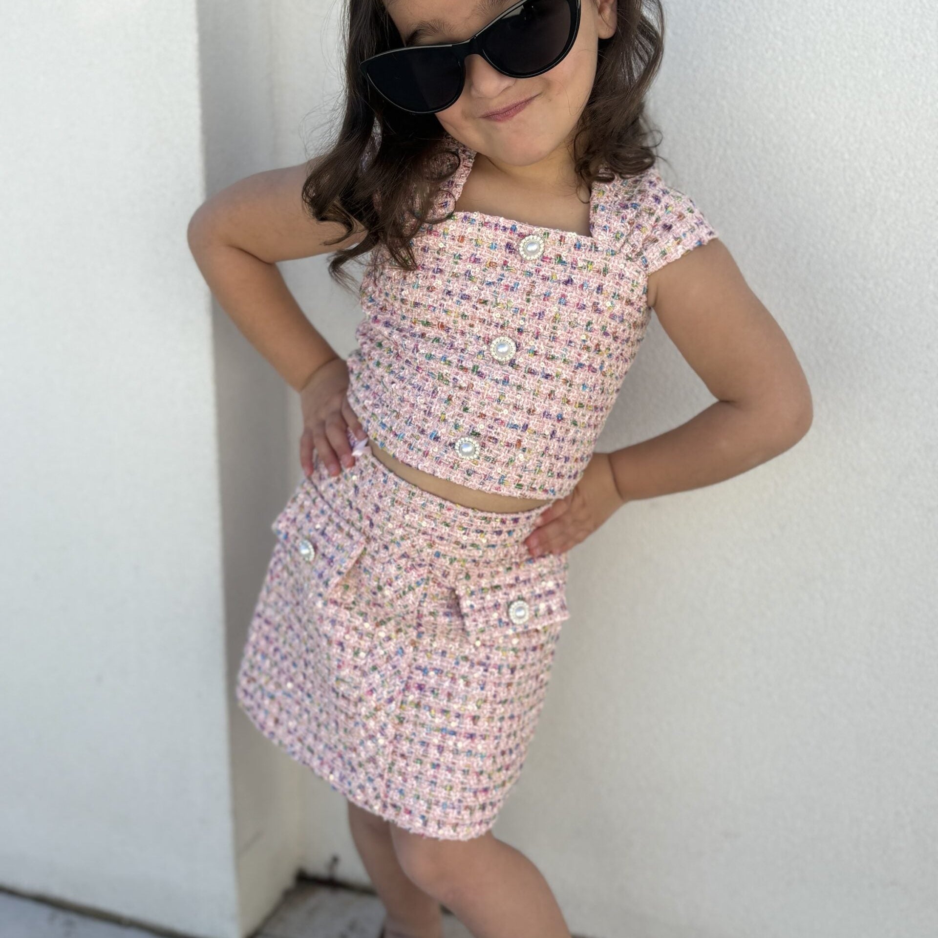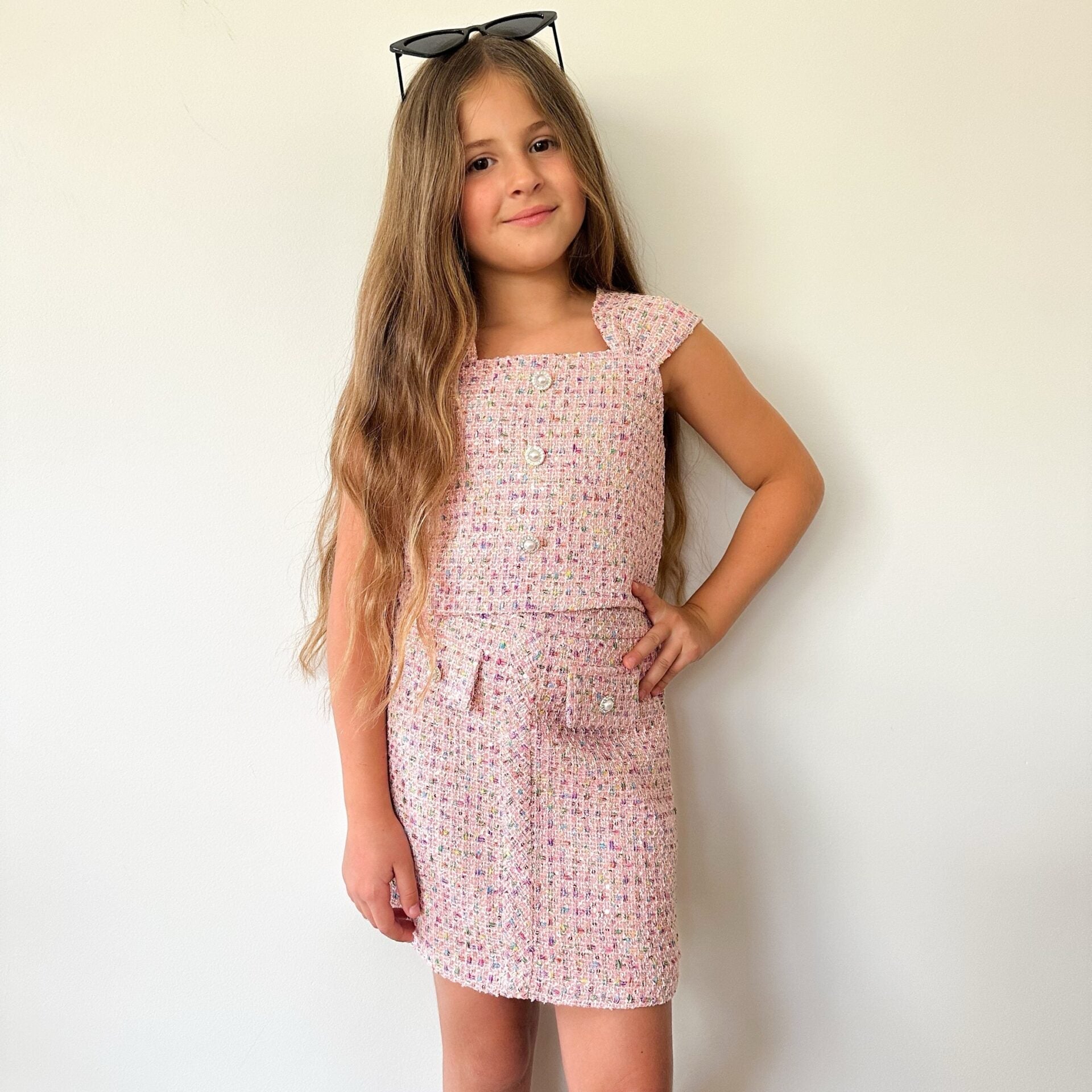 This exclusive JNR LUX CLOSET design features a sophisticated tweed ensemble with subtle sequin detailing throughout. The coordinated set includes a mid-rise top with elegant cap sleeves, finished with a striking exposed back zipper and three pearl button accents at the front. The matching skirt showcases an elasticated waistband, decorative pearl-button pockets, and a refined silhouette. Crafted for young style enthusiasts, this versatile two-piece set delivers contemporary elegance with thoughtful design details.