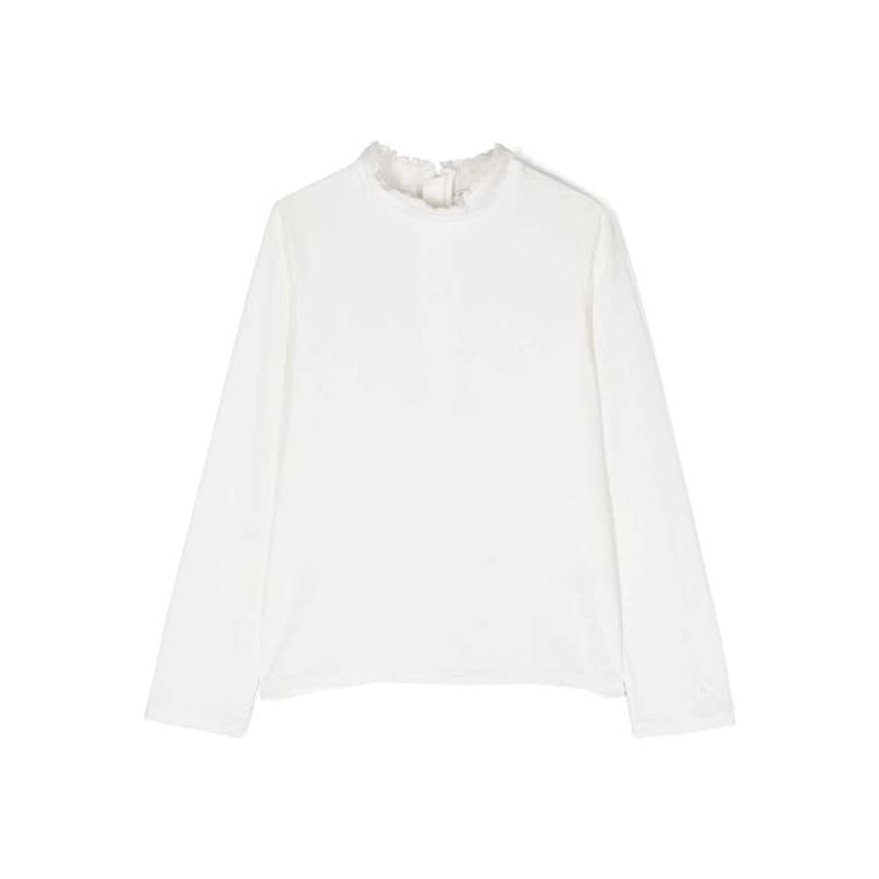Chloé’s Ruffled Collar Blouse from the kidswear line showcases a signature romantic style with its long sleeves and delicate ruffled eyelet collar. Crafted from a soft, stretch organic cotton blend, it features an embroidered floral logo on the cuff for a refined touch. Made with at least 50% organic materials, this blouse combines comfort and sustainability. Composition: 94% organic cotton, 6% elastane. Machine washable for easy care. Style ID: C15E23.
