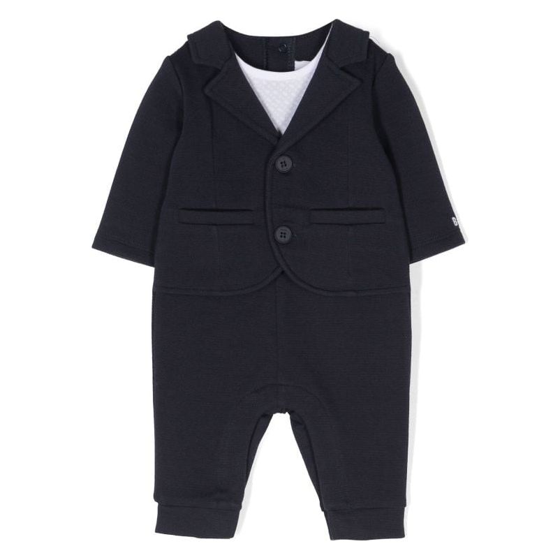 This all in one suit by BOSS features a tailored navy blue design crafted from a cotton blend. It showcases classic lapels, decorative button detailing, and a rear press-stud fastening. With long sleeves, straight leg, and elasticated ankles, this suit offers both style and comfort. Made of 73% cotton and 27% polyester, it is recommended to machine wash for easy maintenance.